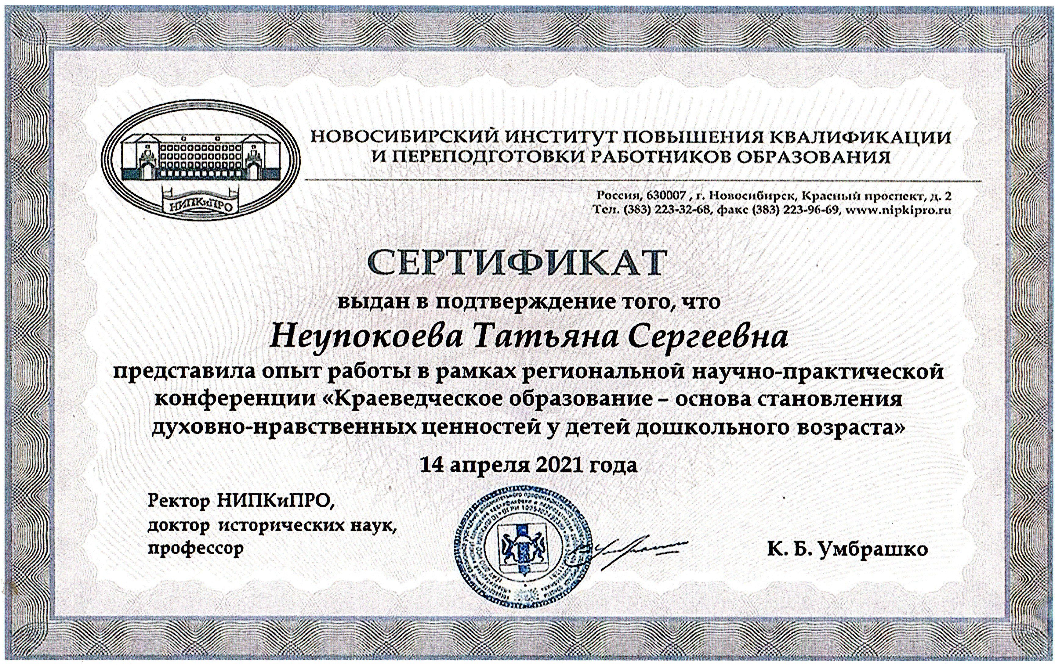 Сертификат о представлении опыта работы в рамках региональной научно-практической конференции "Краеведческое образование - основа становления духовно-нравственных ценностей у детей дошкольного возраста" 2021г.