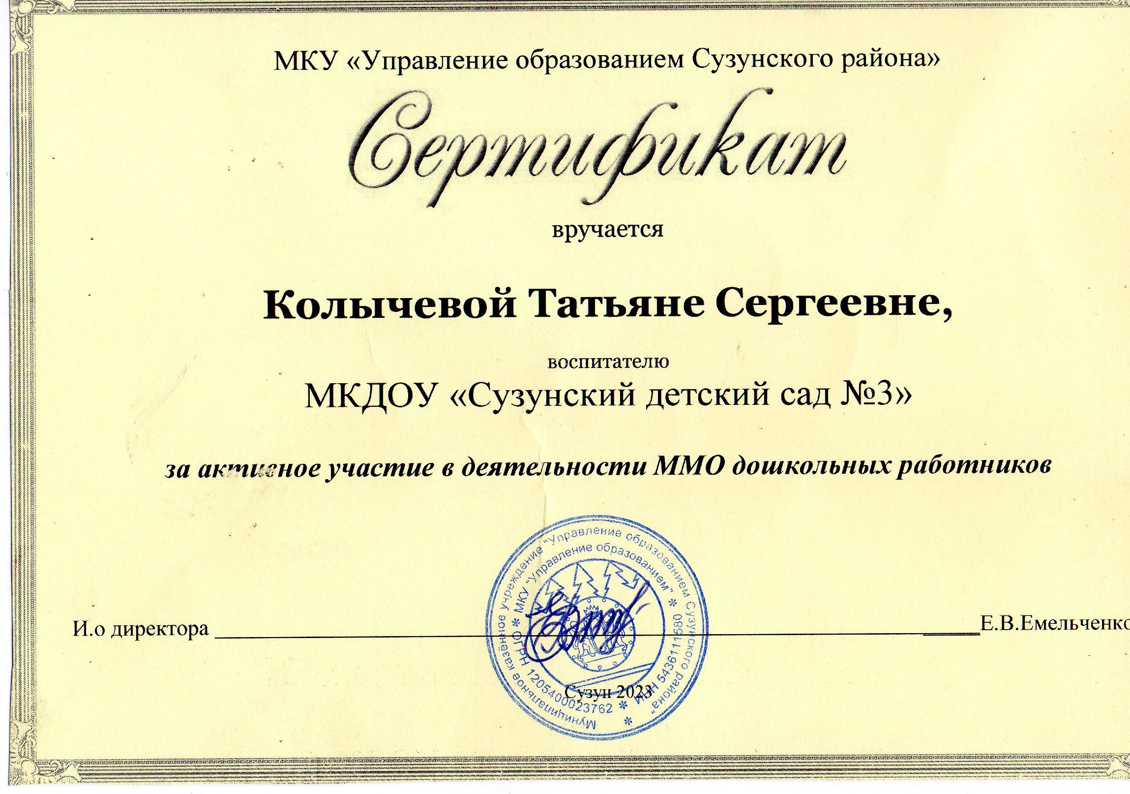 Сертификат за активное участие в деятельности ММО дошкольных работников. 2023г.