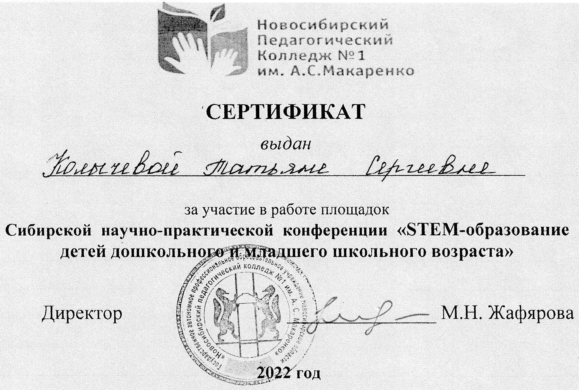 Сертификат за участие в работе площадок Сибирской научно-практической конференции "STEM-образование детей дошкольного и младшего школьного возраста" 2022