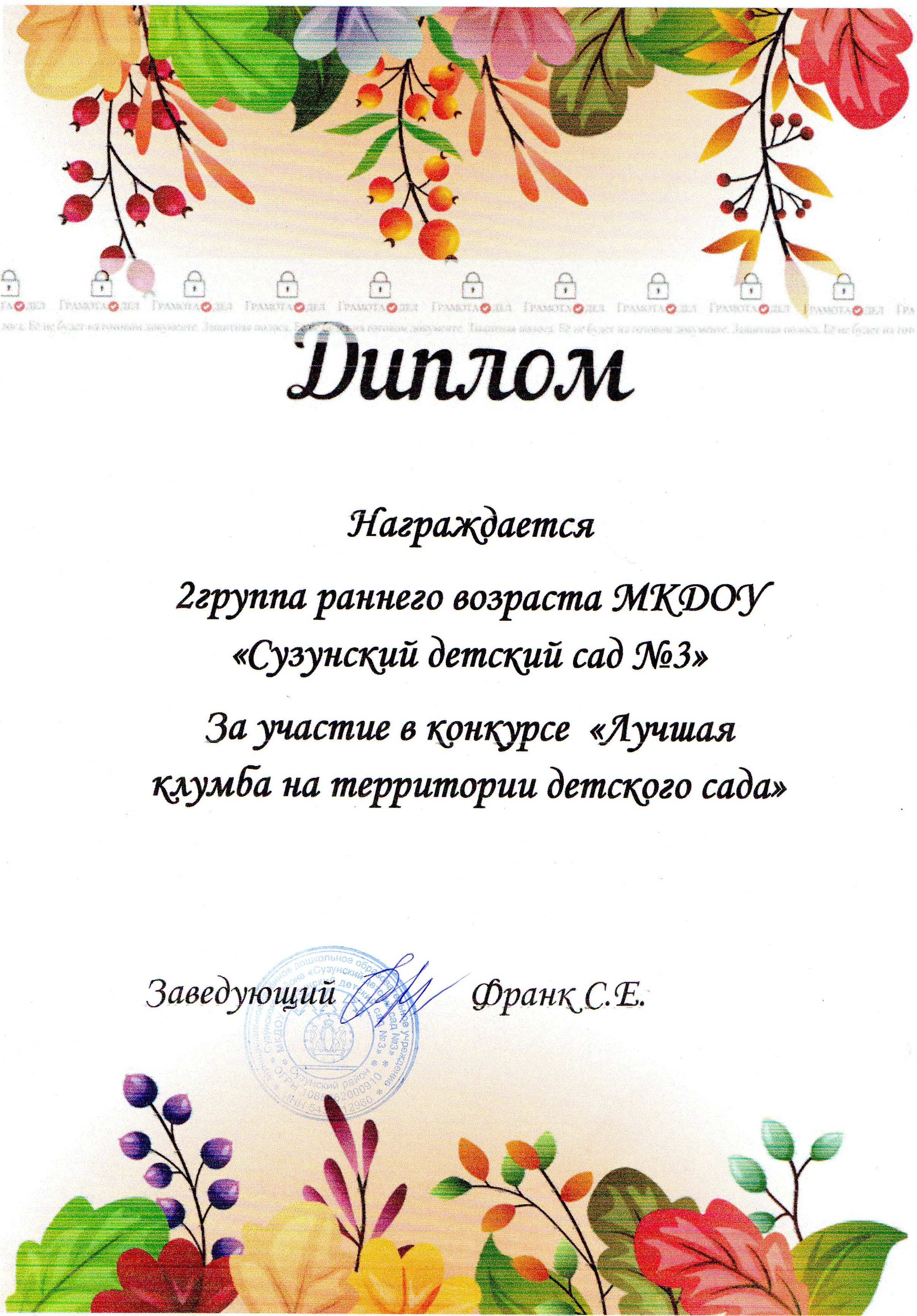 Диплом за участие в конкурсе "Лучшая клумба на территории детского сада" 2022г.