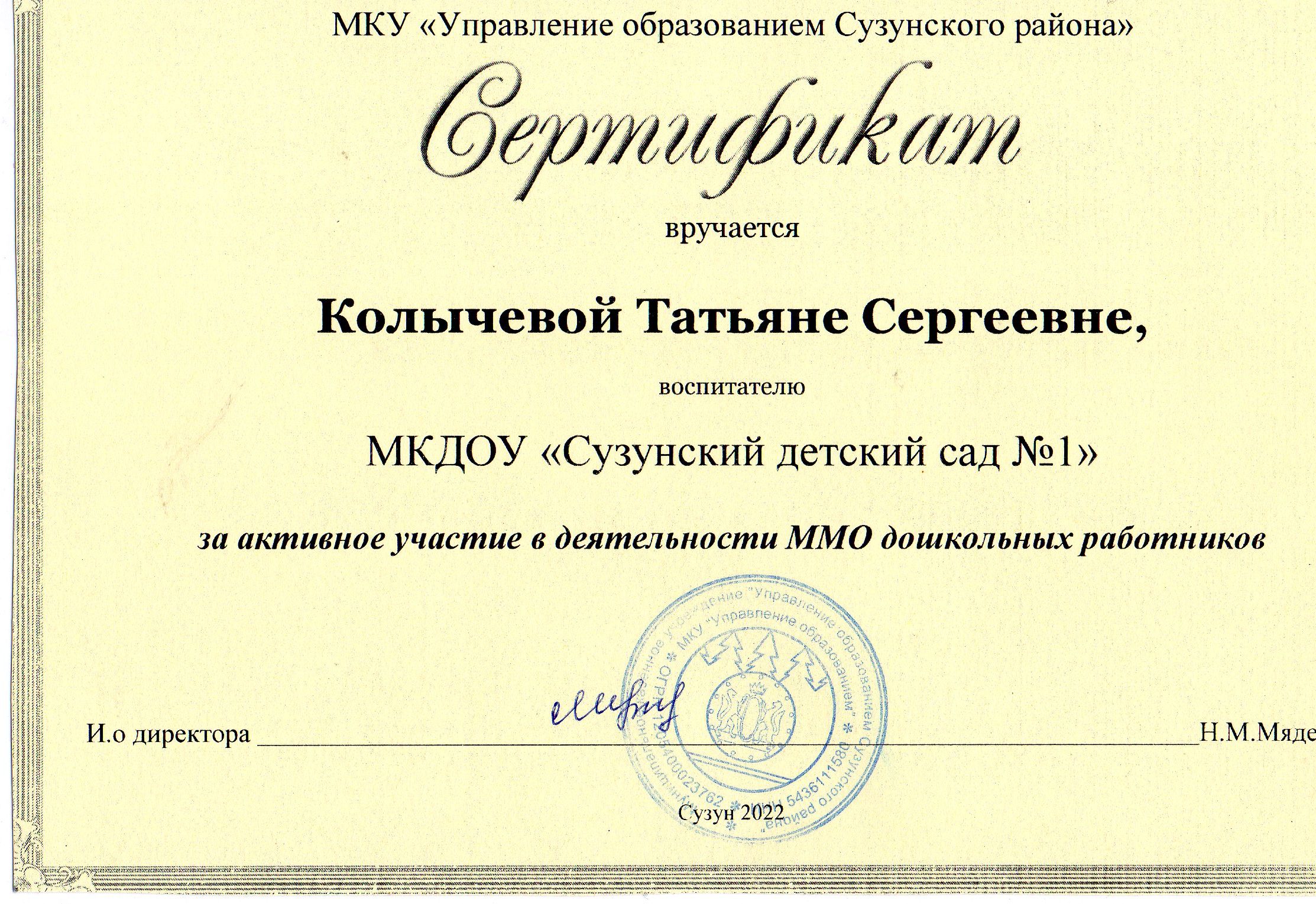 Сертификат за активное участие в деятельности ММО дошкольных работников 2022г.